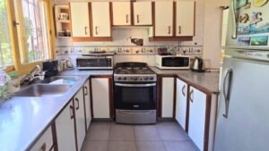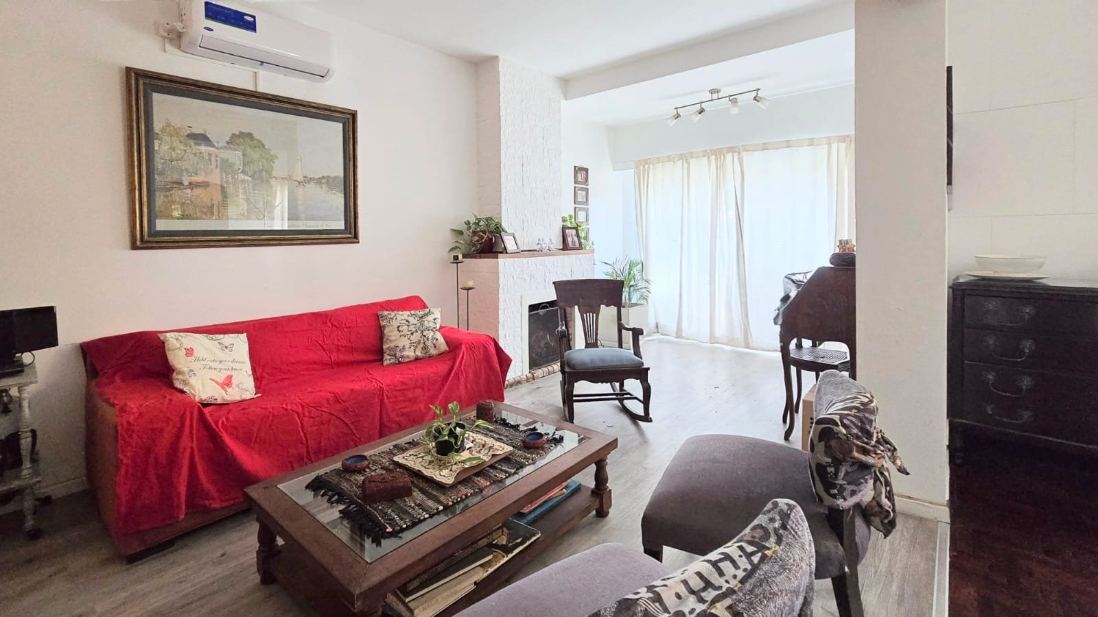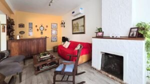 Living con chimenea, comedor, dormitorio, baño completo , cocina con comedor diario y lavadero.